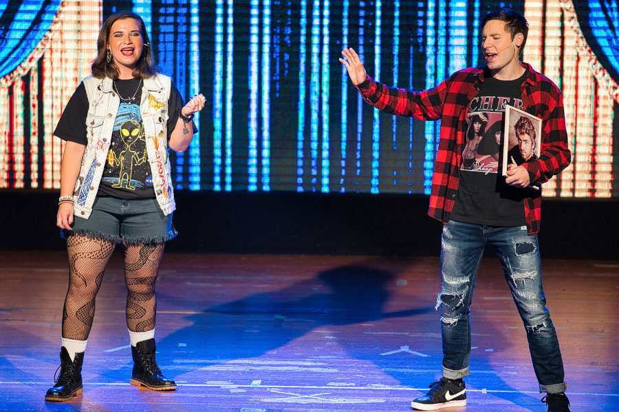 Die Musik läuft an. Alyssa Pfeiffer als Cady sowie Pasquale Osburg in der Rolle von Damian und Johanna Becker, die Janis spielt, starten mit dem ersten Song. Mit kurzen Handbewegungen korrigiert Göbel, der vor ihnen auf einem Barhocker Platz genommen hat, ab und an Kleinigkeiten in der Choreografie. Die Truppe probt seit Anfang Mai, und da sitzen Texte und Bewegung bestens.